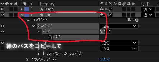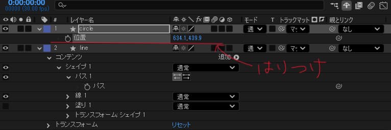 今描いた線のパスをコピーして、動かしたいシェイプの「位置」にペーストします
