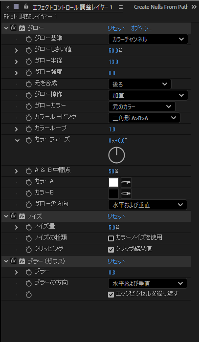 調整レイヤーを配置し、先ほどの「グロー→ノイズ→ブラー」をかけます