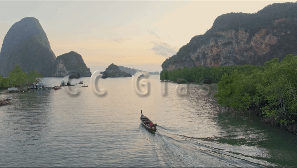 タイムラインで、テキストレイヤーの「目玉」アイコンをクリックして非表示にします。 これで、テキスト本体は見えなくなり、その形をした歪みだけが背景に残ります。