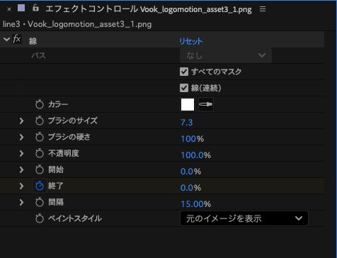 ペンツールで作ったマスクにエフェクトの「線」を加えたあと、一番下のペイントスタイルを、「元のイメージを表示」にしないと、マスクが表示されないという…